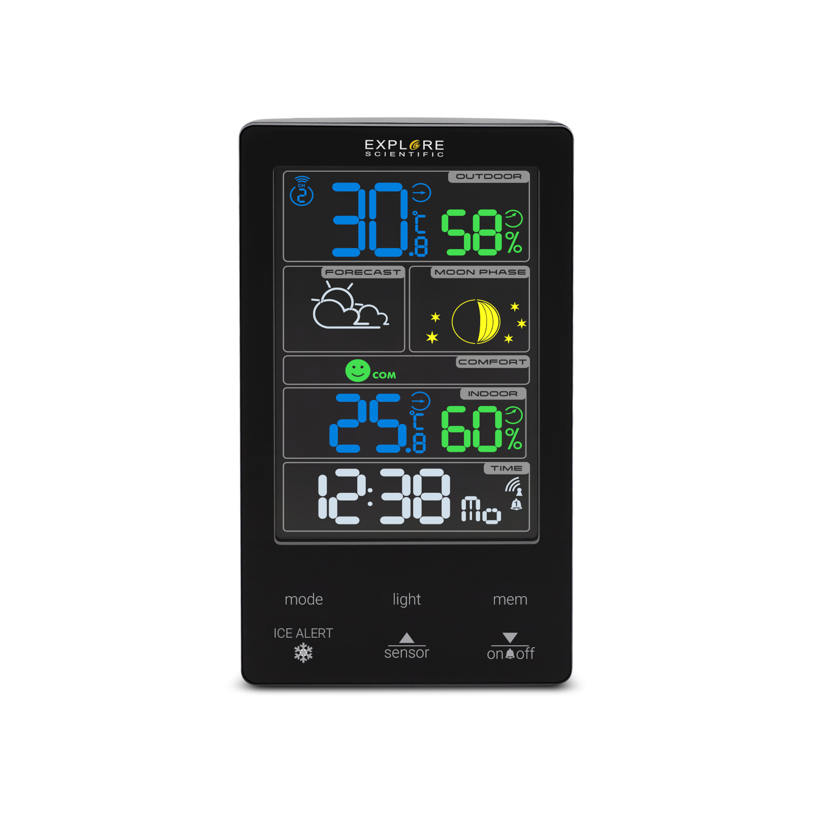 Les prévisions météorologiques pour les 12 prochaines heures sont déterminées à partir des valeurs mesurées et affichées graphiquement. Bien entendu, l'heure actuelle, transmise via le signal radio DCF, le jour de la semaine, l'affichage de confort et la phase de lune sont également affichés. Vous avez également la possibilité de régler deux heures d'alarme et, après la sonnerie du réveil, d'activer la fonction de répétition en appuyant sur le bouton d'éclairage pour retarder l'alarme de 8 minutes.