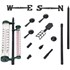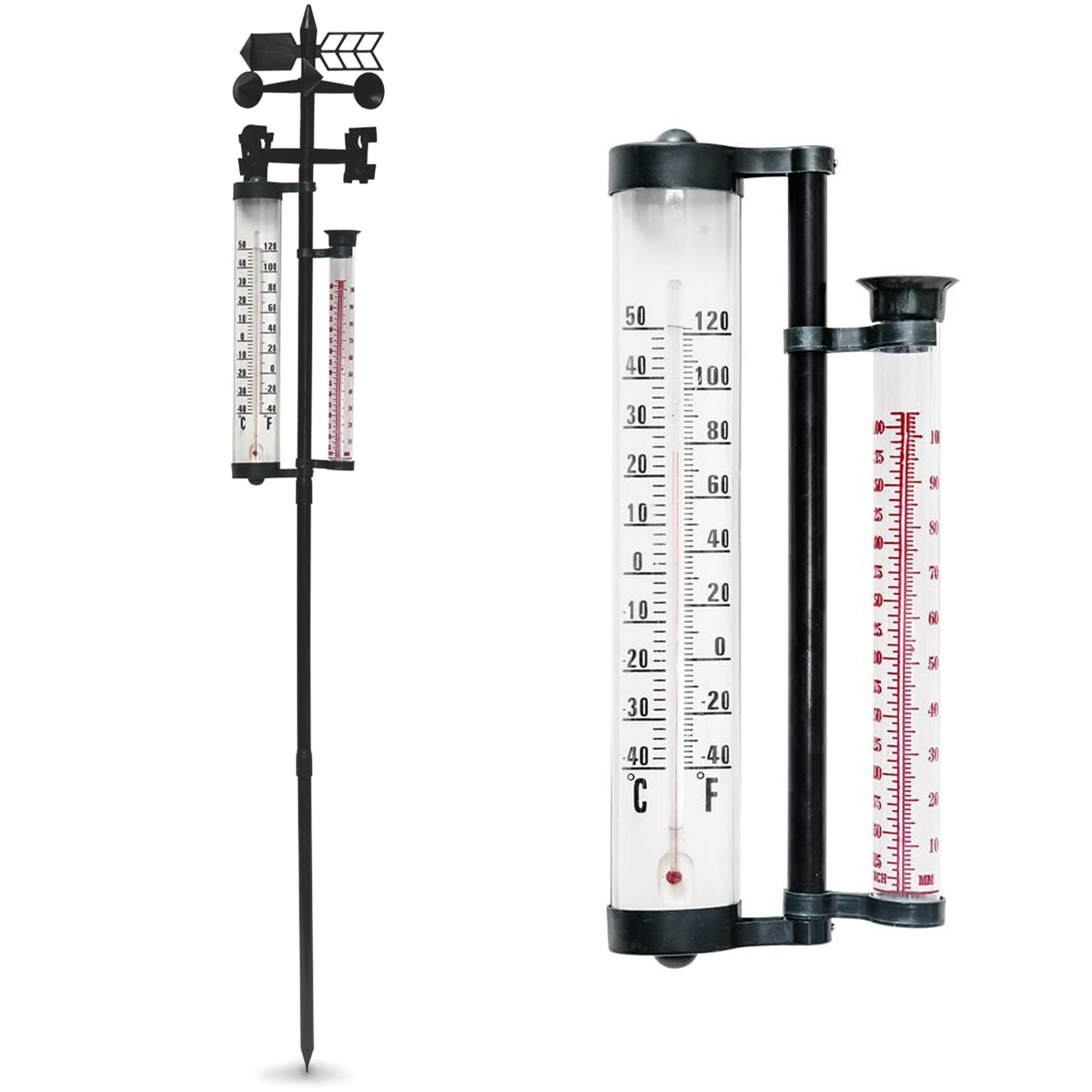 CARACTÉRISTIQUES - Thermomètre en vert foncé avec grands caractères, plage de température de -40 à +50 °C en Celsius et Fahrenheit, dimensions env. 38 x 7 cm; Pluviomètre avec caractères rouges et grands, échelle en inch et mm, unité en mm de 0 à 100, en inch de 0 à 40, dimensions env. 31 x 3,5 cm; Indicateur de direction de vent manuel avec 3 boules creuses pour mesurer la vitesse du vent