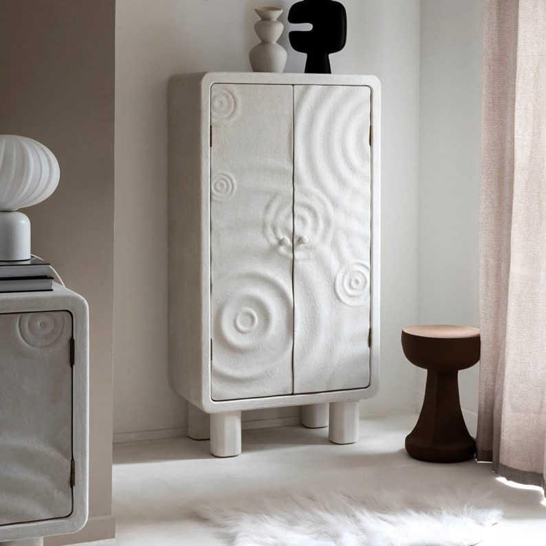 Buffet en polyrésine blanche avec reliefs circulaires sculptés. Deux portes, étagères intérieures fixes, pieds cylindriques. Design graphique et compact, collection Danaé.