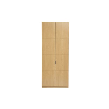 La façade de l?armoire GARENCE se distingue par un motif graphique en relief , soulignant ses panneaux sans surcharge visuelle. Les poignées ajustables et discrètes en métal noir contrastent avec la teinte claire du bois, ajoutant une note design subtile et raffinée. Les charnières robustes assurent une ouverture fluide et durable au quotidien, renforçant le confort d?utilisation.