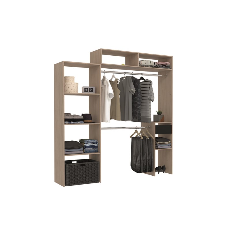 Elysee dressing bois extensible avec penderie, étagères et tiroirs