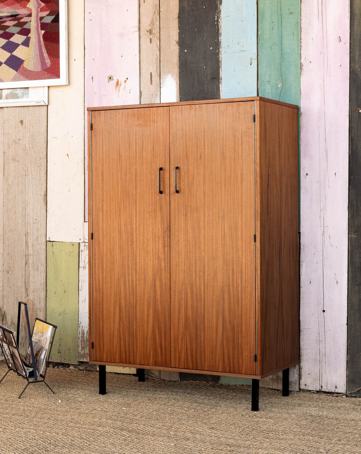 Découvrez l'élégance intemporelle de notre armoire en plaquage bois exotique des années 60. Ses pieds en métal robuste et ses poignées en métal ajoutent une touche de modernité à un design vintage. Avec ses trois étagères à hauteur réglable, cette armoire allie style et fonctionnalité, parfaite pour créer un espace de rangement à la fois esthétique et pratique. Transformez votre intérieur avec ce meuble emblématique qui raconte l'histoire du design d'antan.