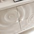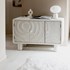 Buffet bas 3 portes en polyrésine blanche avec reliefs circulaires. 6 compartiments de rangement, design sculptural et pieds cylindriques. Collection Danaé.