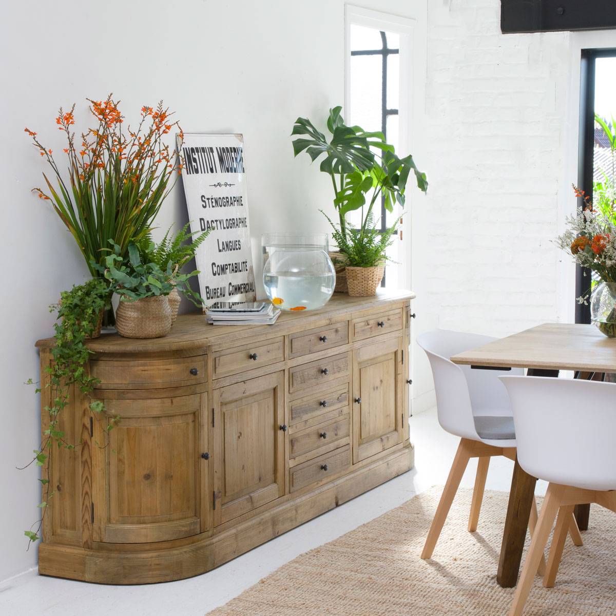 Ce buffet arrondia été réalisé à partir de vieux pin brossé qui lui confère un charme indéniable. Vous allez adorer les nuances claires et lumineuses de son bois qui apporteront des ondes positives au sein de votre intérieur. Petit coup de coeur pour ses poignées en laiton qui apportent une petite touche de modernité à l'ensemble du meuble. Il a été pensé de façon à vous offrir un maximum d'espaces de rangements. Il comporte donc 4 portes (avec une planche pour chaque porte à l'intérieur), et se décline en deux versions : 9 tiroirs pour le grand modèle, et 4 tiroirs pour le petit modèle. Ce buffet enfilade est livré monté,