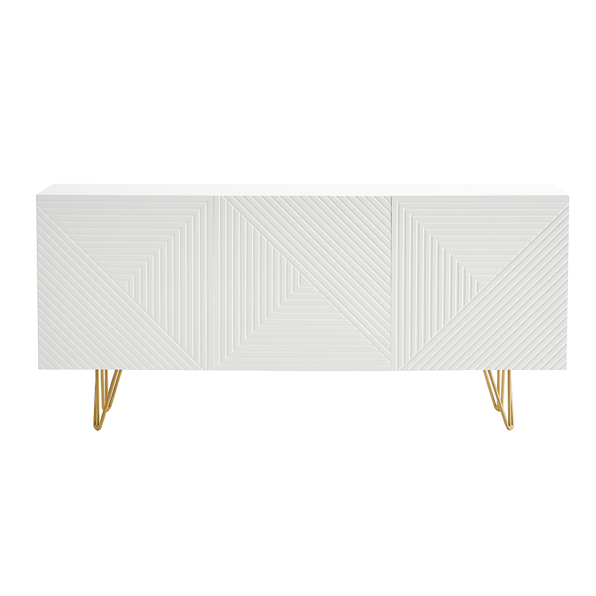 Avec le buffet OZEN , les intérieurs contemporains ont trouvé leur perle rare ! Petit bijou de design, ce buffet moderne se démarque par son originalité. Les trois portes sont ornées d'un magnifique motif géométrique en relief ton sur ton. Atypique mais discret, il fait toute l'élégance de ce meuble de rangement en enfilade. Le blanc immaculé de la structure est réhaussé par un piètement épingle en métal doré . Ce détail chic et coloré est travaillé avec finesse pour un style tout en légèreté.