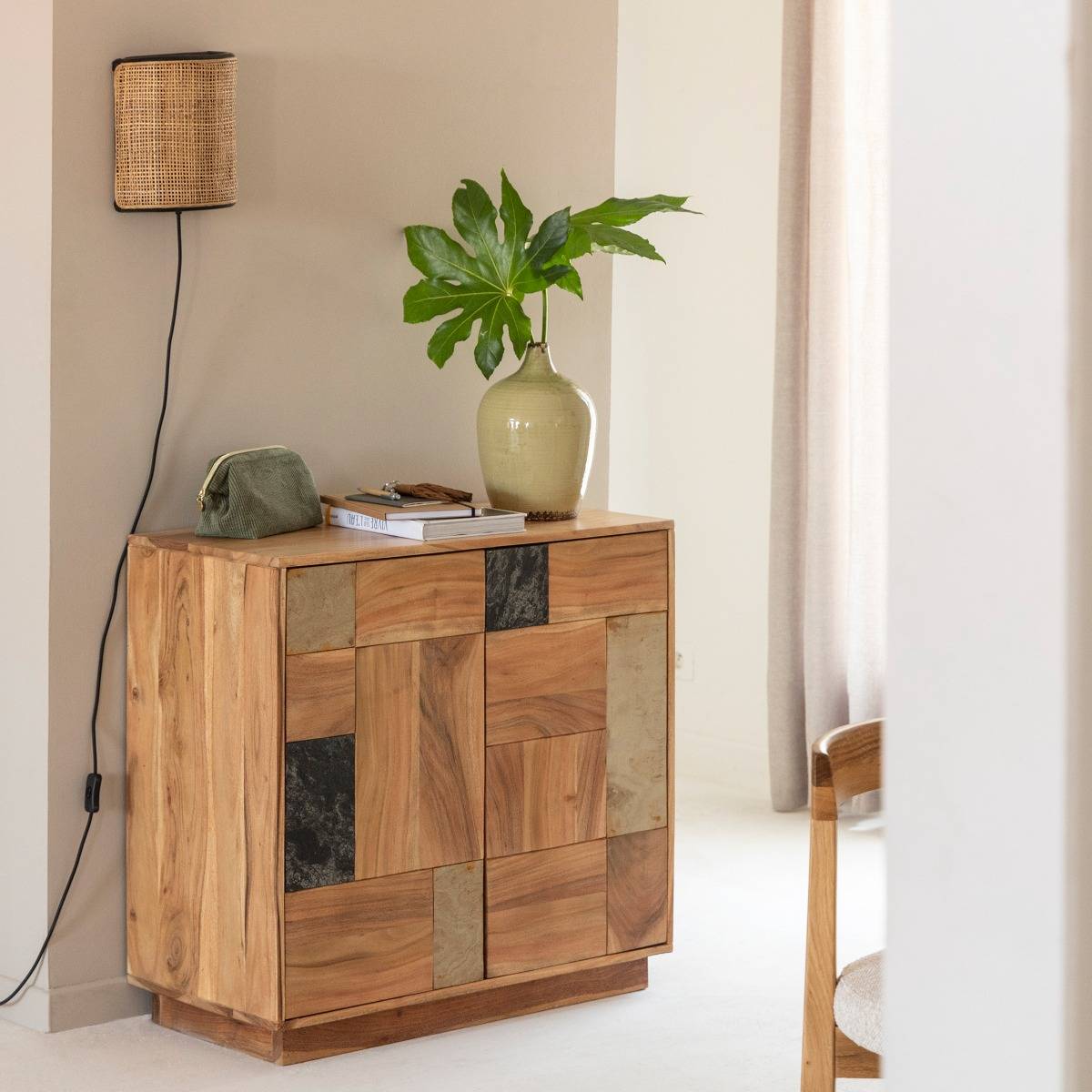 Buffet en acacia massif avec façade effet patchwork. Mélange de bois naturel et inserts colorés pour un look graphique. 2 portes, rangement pratique. Idéal pour une déco contemporaine, urbaine ou originale.