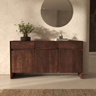 Idéal pour sublimer votre salon, ce buffet se marie parfaitement avec des bougies, des plantes ou d'autres éléments de décoration.-Contenu : Vendu à l'unitéDimensions : Longueur : 150 cm Profondeur : 40 cm Hauteur : 80 cm Hauteur des pieds : 14 cm Tiroirs (x3) : 48 x 15 cm Portes (x3) : 48 x 47 cmMatière : Buffet en bois de manguierInfos complémentaires : La teinte du bois peut varier entre les produits en raison de la nature unique de chaque planche de bois massif, influencée par des facteurs comme les noeuds, la coupe et le séchage.Montage : Aucun montagePoids produit : 55.2kgEntretien : Pour entretenir votre buffet en bois de manguier, dépoussiérez-le régulièrement avec un chiffon doux et sec, et appliquez une huile spéciale pour bois tous les six mois pour nourrir et protéger le bois.Information colis : 160 x 92 x 51 cmRecyclabilité : Totalement recyclable
