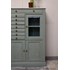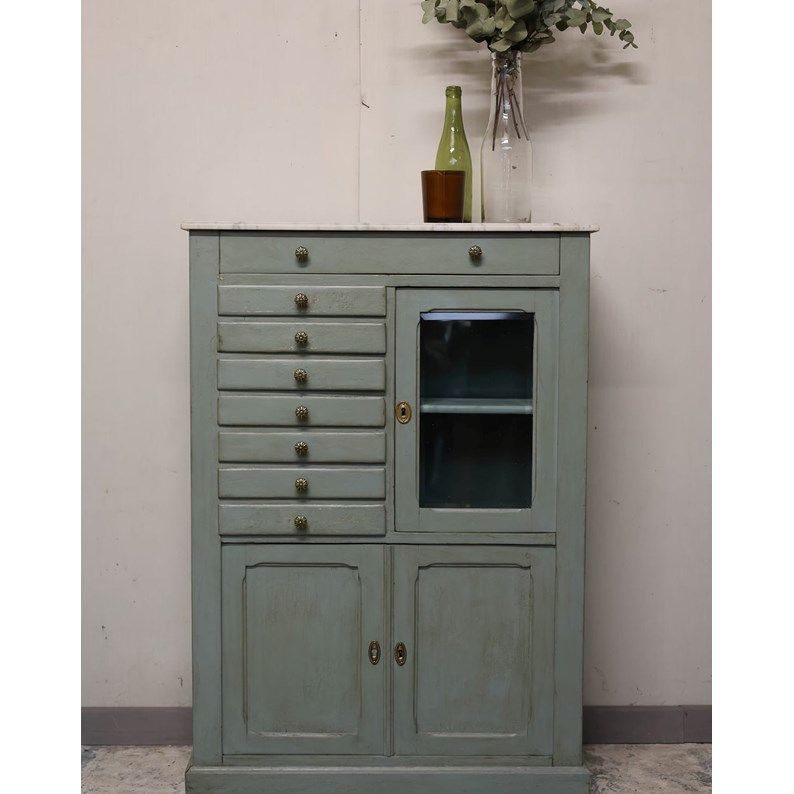 Adoptez ce charmant meuble de dentiste des années 1900 en bois peint vert, doté d’un plateau en marbre blanc et d’ornements en bronze et laiton d’origine. Sa composition soigneuse et ses proportions étroites offrent une solution de rangement idéale pour la salle de bain ou un atelier, avec petits tiroirs et tiroir supérieur qui glissent parfaitement. La porte vitrée et les vantaux bas ferment à clef, soulignant son esthétique fonctionnelle et cabinet d’époque. Meuble entièrement restauré ; la partie marbre présente des traces d'usage et un ancien recollage en son milieu.