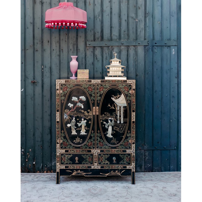 Sublimez votre intérieur avec ce meuble asiatique en bois rehaussé de nacre en relief aux teintes multicolores. Sa silhouette élancée, sa niche généreuse et son tiroir discret offrent un rangement fonctionnel, idéal pour une entrée, un salon ou une chambre. La nacre sculptée capte la lumière et insuffle une patine artisanale chaleureuse, tandis que la structure en bois affirme un style à la fois sobre et raffiné.