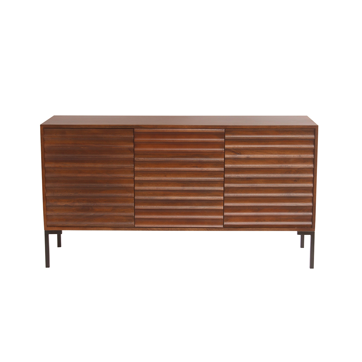 Ce buffet design à la silhouette affirmée est issu d'un superbe travail sur la matière. Réalisé en manguier massif , il se distingue par sa façade qui semble creusée par des sillons. Ce bois chaleureux et exotique a été travaillé de façon artisanale faisant de chaque buffet une pièce unique . La patine marron foncé appliquée sur ce buffet en bois nourrit la matière tout en renforçant un peu plus son caractère authentique.