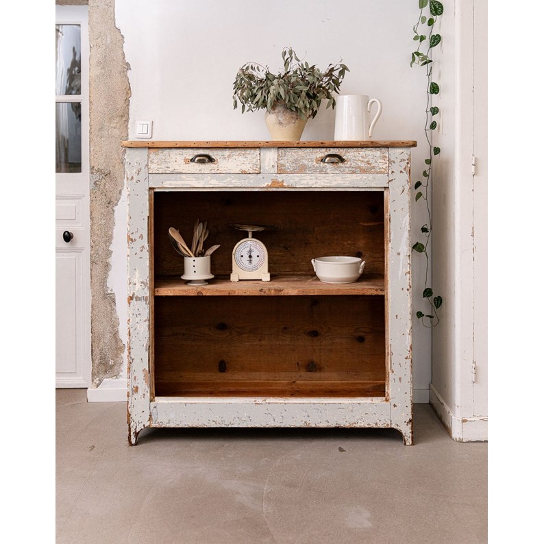Découvrez ce buffet de campagne en bois patiné bleu-gris, aux lignes chaleureuses et au charme discret. Ses deux tiroirs munis de poignées coquillage métalliques et sa partie basse ouverte dotée d'une étagère offrent un bel équilibre entre rangement et mise en scène pour vaisselle, textiles ou livres. Son style champêtre élégant installe une atmosphère conviviale et raffinée dans la cuisine ou la salle à manger. Quelques traces du temps présentes.