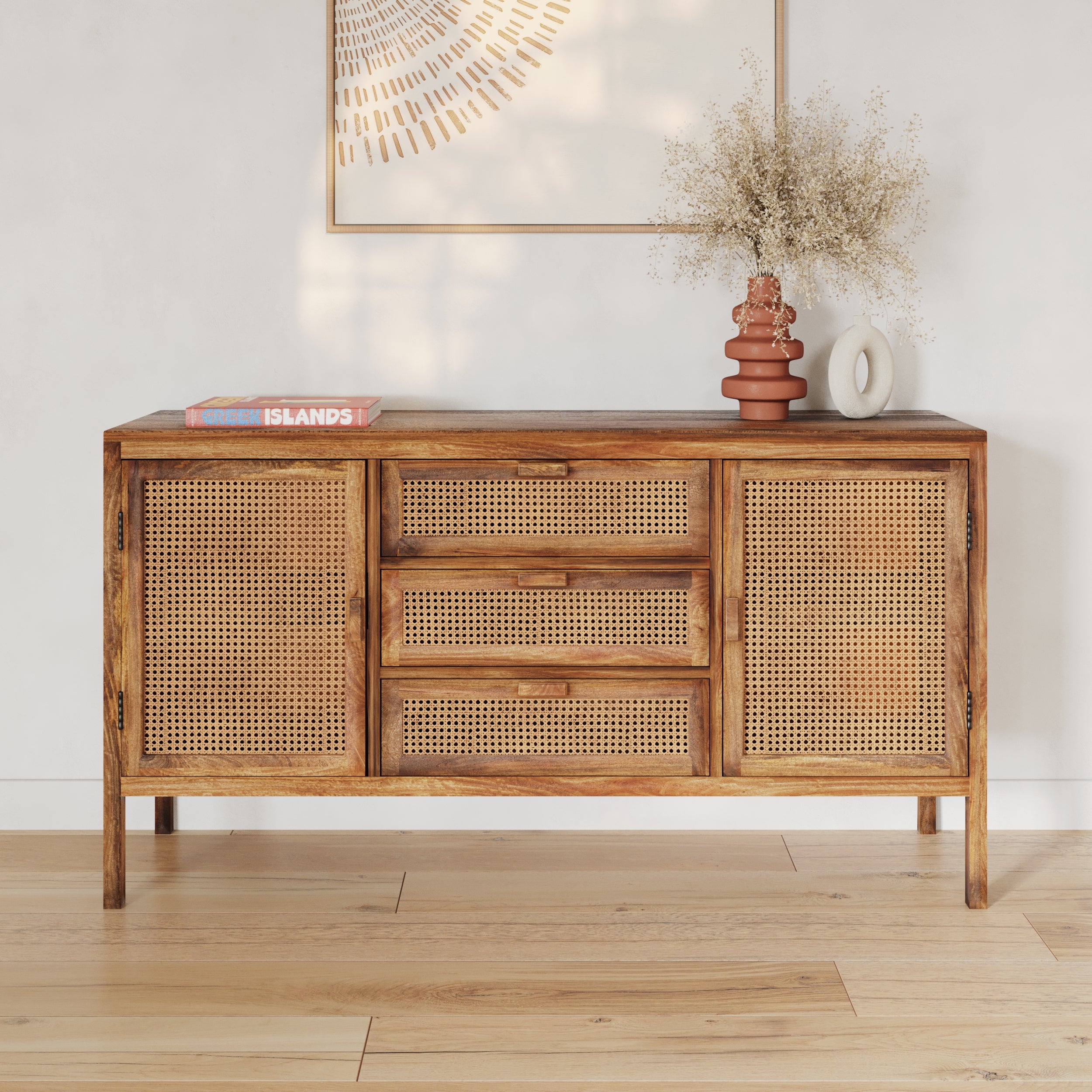 Installé dans votre pièce à vivre, le buffet cannage Tiki 2 portes 3 tiroirs illuminera l'espace de sa teinte naturelle et douce. Vous serez sous le charme du manguier en harmonie avec le cannage des portes et tiroirs.