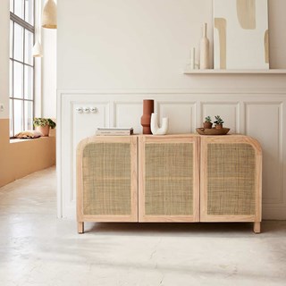 Le cannage sur les trois portes, le bois clair discret, les bords arrondis... Ce buffet en bois de mindy et cannage s'installera aisément dans votre salle à manger. Caractéristiques : Matière : Mindi - Couleur : Naturel – Hauteur : 80 cm – Longueur : 150 cm – Profondeur : 45 cm - Poids : 35 kg - Garantie : 5 ans - Montage : Livré monté