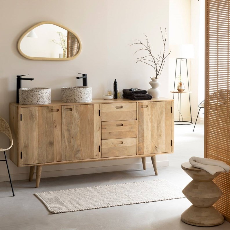 Le meuble de salle de bain en bois de manguier allie élégance et robustesse. Avec ses dimensions de 40 x 180 x 85 cm, il offre un rangement spacieux tout en restant discret. Son design épuré s'intègre facilement dans divers styles de décoration, faisant de lui un choix élégant et durable.