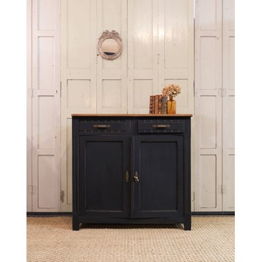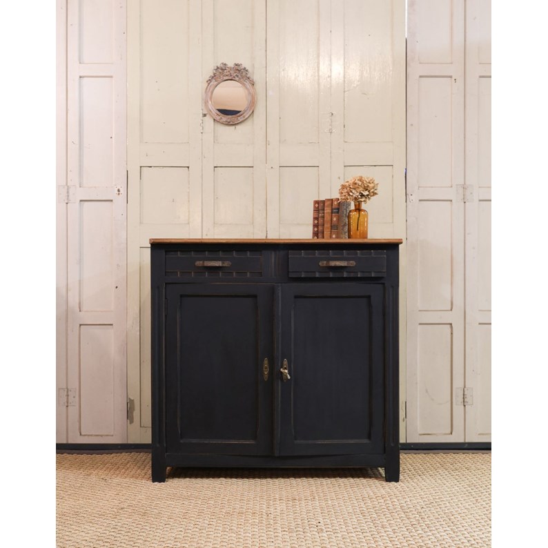 Découvrez ce buffet en bois peint noir, au design sobre rehaussé de deux poignées métalliques ornées d'un délicat motif floral. Sa peinture profonde contraste avec l'intérieur en bois clair, soulignant la qualité des matériaux et un caractère à la fois vintage et contemporain. Compacité et proportions étudiées lui permettent d'accueillir vaisselle, linge ou petits objets grâce aux deux tiroirs et à l'étagère intérieure verrouillable par clé, parfait pour organiser un séjour ou une entrée avec élégance.