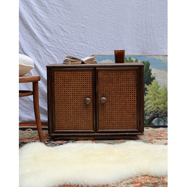 Adoptez ce petit buffet vintage vintage en bambou et cannage, au charme naturel et artisanal. Ses deux portes à boutons en bois révèlent un intérieur délicatement habillé d'un papier peint fleuri, qui met en scène vos objets et apporte une note poétique. Son format la rend idéale pour un couloir, une salle de bains ou une chambre où l'on cherche un rangement discret et léger. Le mariage du bambou et du cannage crée une ambiance chaleureuse et aérée.