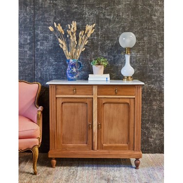Sublimez votre intérieur avec ce buffet en bois et son plateau en marbre, alliance d'un esprit vintage et d'une élégance sobre. Sa silhouette généreuse et ses matériaux naturels offrent un rangement pratique et une surface de service idéale pour la salle à manger ou l'entrée, tandis que la patine du bois apporte chaleur et caractère. Quelques perforations sur le marbre témoignent de l'ancienne présence d'un second corps sans altérer l'esthétique ni l'usage.
