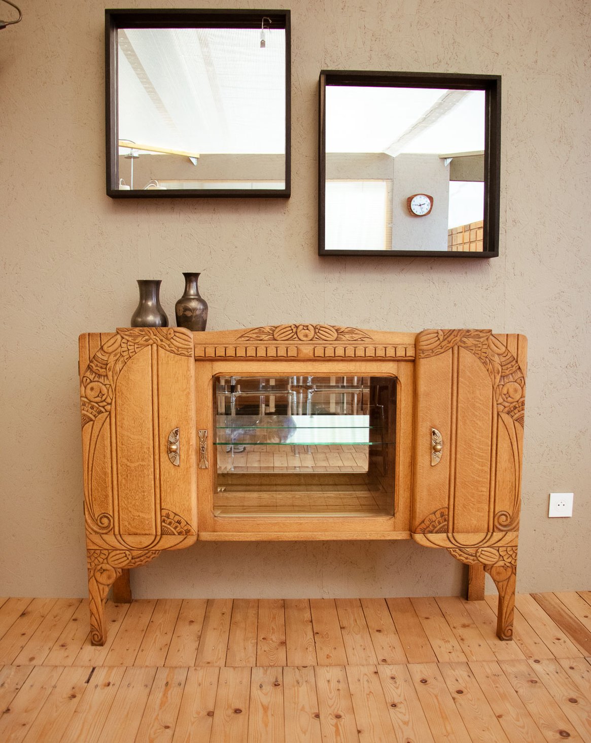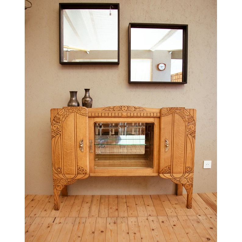 Sublimez votre intérieur avec ce buffet Art déco des années 20 en chêne massif, orné de moulures raffinées et de lignes élégantes. Deux portes en bois et une porte vitrée biseautée dévoilent une vitrine équipée d'un miroir au fond, d'étagères en verre et de compartiments astucieux, pour un rangement modulable en buffet, mini-bar ou console. Ses proportions contenues et ses pieds fins lui donnent une présence discrète et chaleureuse, idéale pour introduire une touche rétro sophistiquée dans salon ou entrée.