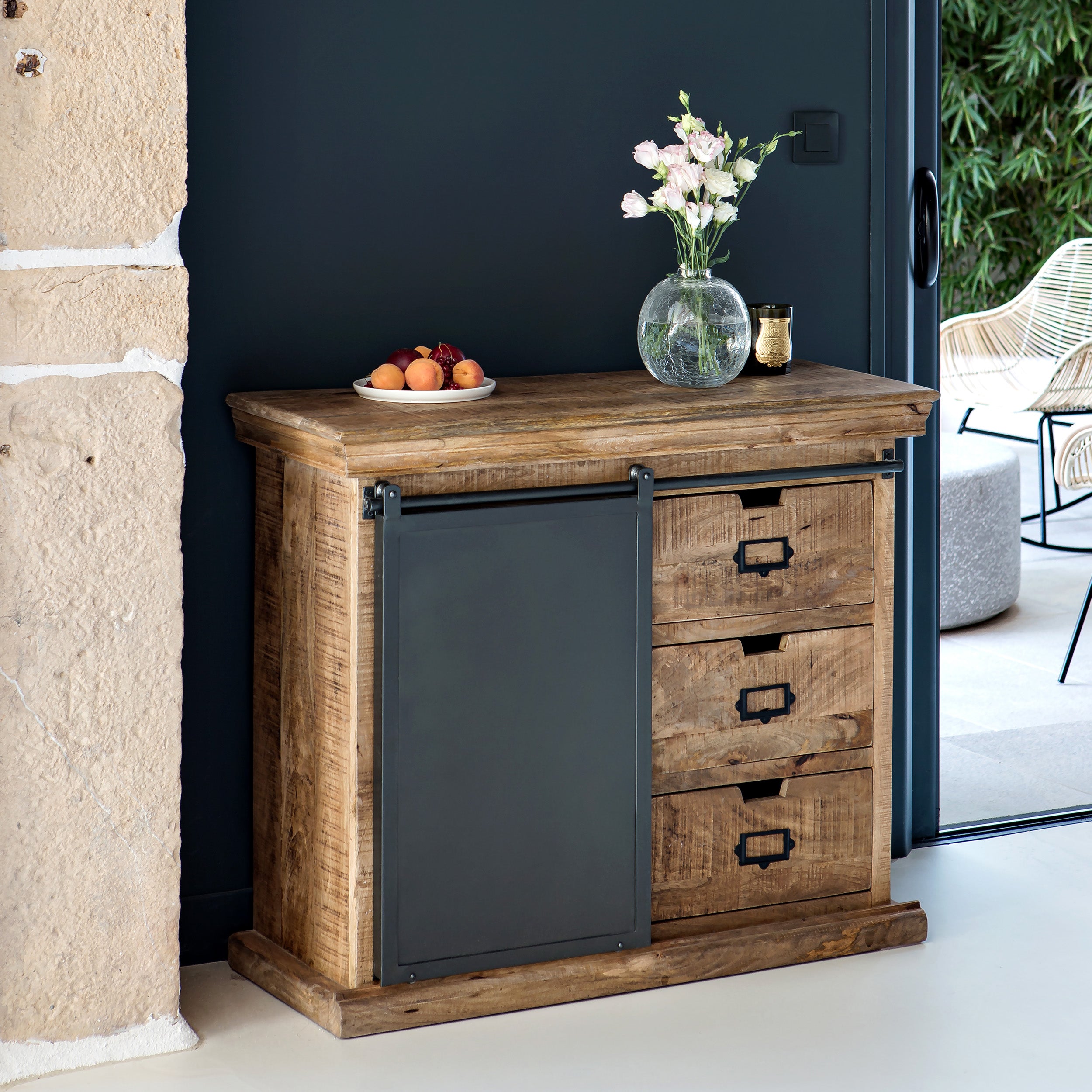 Installé dans votre pièce à vivre, espace repas ou bureau, notre buffet Tabuk apportera son caractère esprit loft. Parfait dans un style brut, il s'adapte également à une ambiance scandinave ou classique.-Contenu : 3 tiroirs + 1 porte coulissanteDimensions : Longueur : 100 cmProfondeur : 40 cmHauteur : 85 cmTiroir (x3) : 40 x 19 cmPorte coulissante : 48 x 67 cmMatière : Bois de manguier massif + porte en métalInfos complémentaires : La couleur de bois utilisé pour la fabrication de ce petit buffet peut varier d’un produit à un autre car chaque planche est unique et dépend de multiples facteurs pouvant influer sur le coloris final (noeuds, plan de coupe, séchage...).Eviter de positionner le meuble près d'une source de chaleur ou un endroit humideMontage : Aucun montagePoids produit : 34.5kgEntretien : Choisissez un produit d'entretien dédié ou de l'eau tiède savonneuse à utiliser avec un chiffon doux. Séchez tout de suite.Information colis : 107 x 47 x 92 cmRecyclabilité : Totalement recyclable