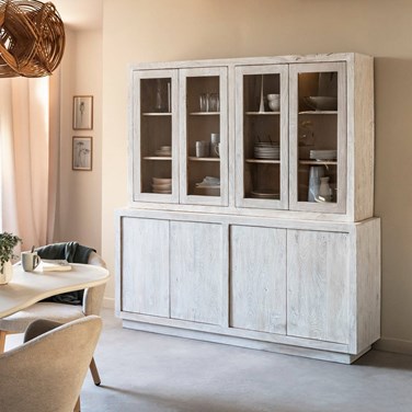 Vaisselier Alison en manguier blanchi avec portes vitrées et grand espace de rangement. Style lumineux, authentique et intemporel.
