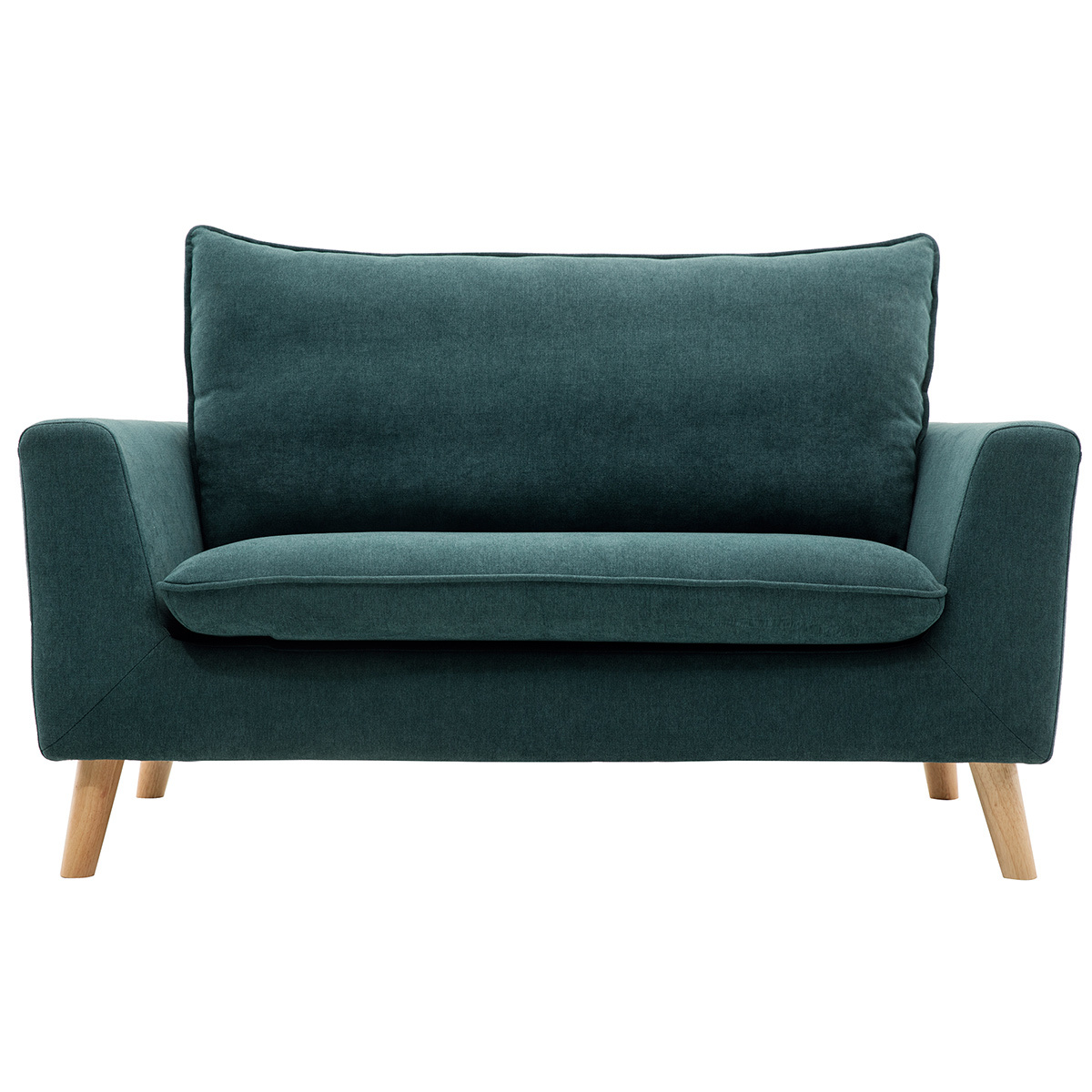 Canapé scandinave 2 places en tissu effet velours bleu canard et bois clair JONAS livré prêt à assembler.