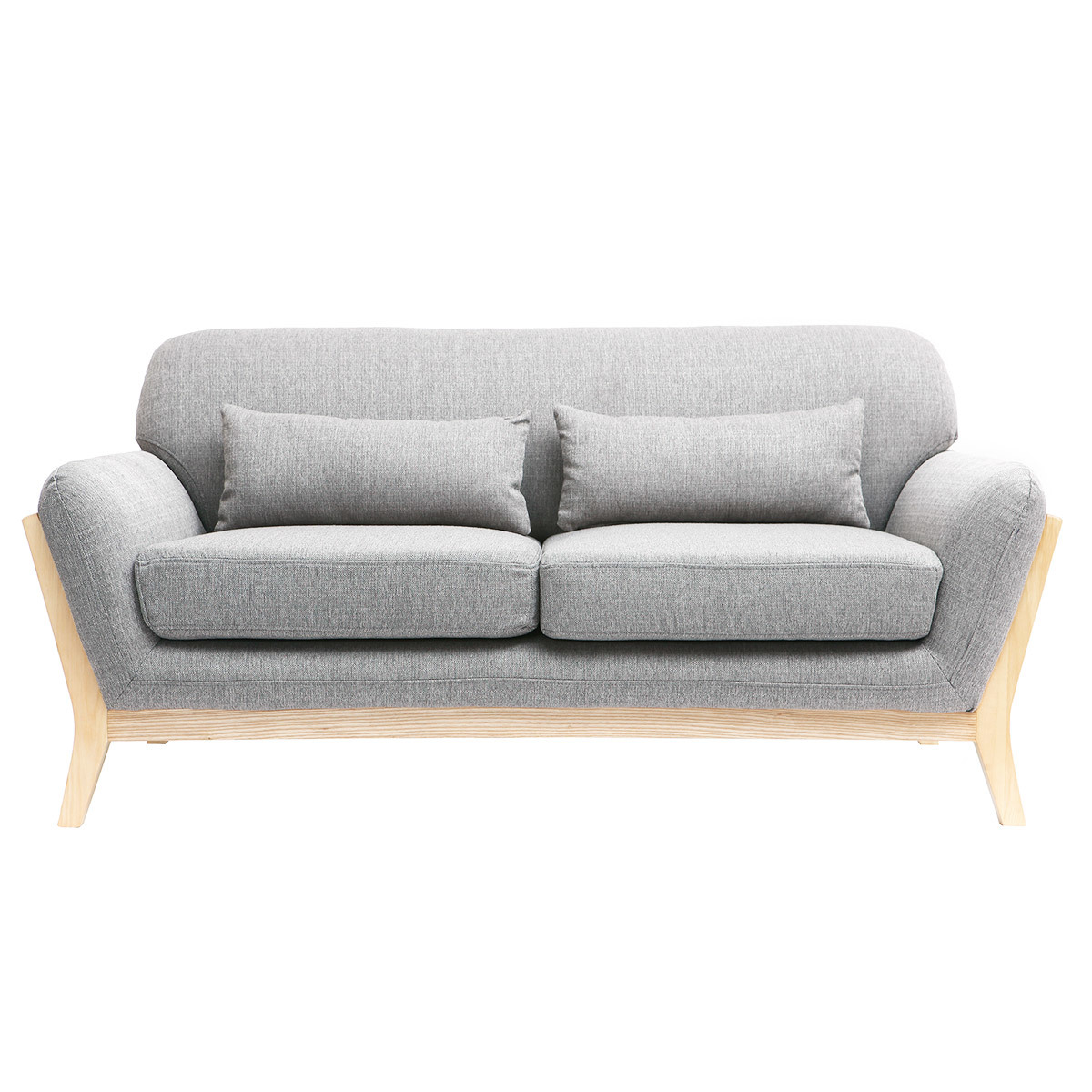 Le mariage entre une assise généreuse, habillée d'une trame 100% polyester - aussi agréable à l'oeil qu'au toucher - et une structure apparente en bois massif (frêne massif), fait tout le charme de ce canapé en tissu gris clair et bois .