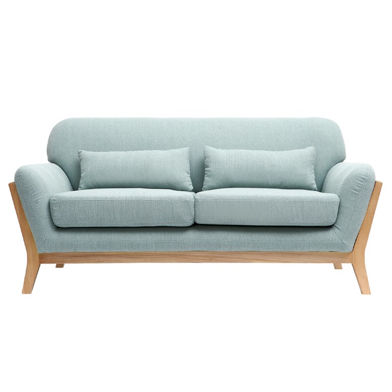 Canapé 2 places en tissu vert lagon et bois clair yoko