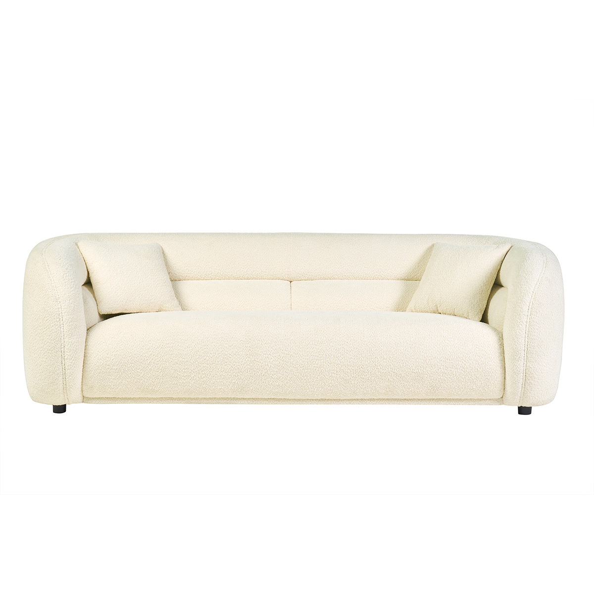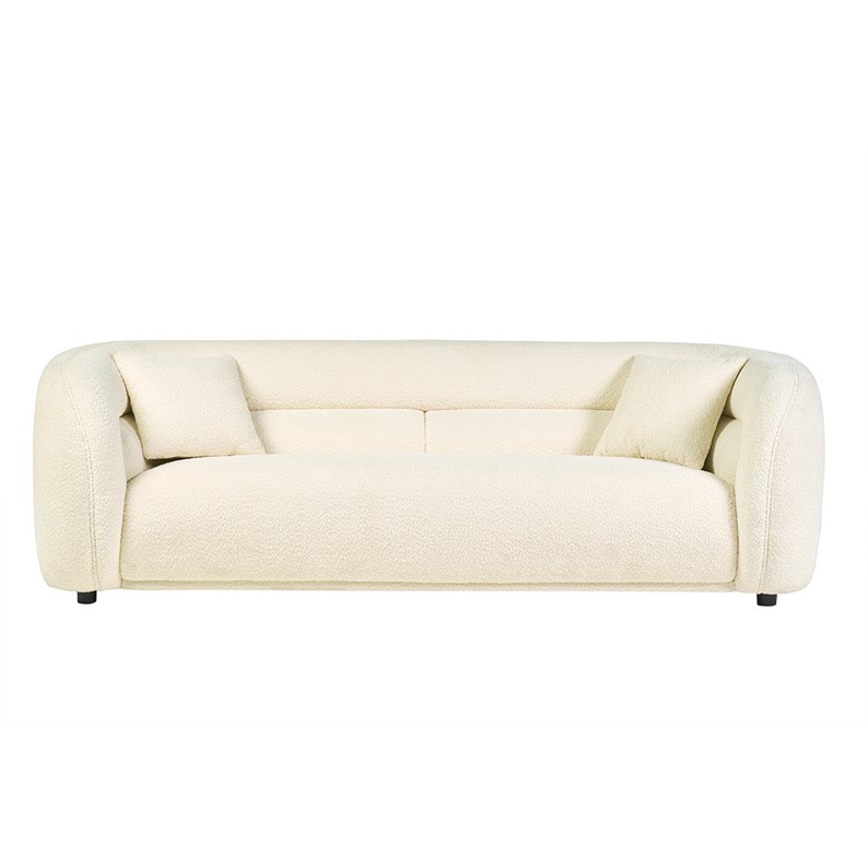 Habillé d'un tissu bouclette blanc cassé et accompagné de ses 2 coussins (41 x 41 cm), MOCHI séduit par son allure douce et accueillante. Ses courbes généreuses et ses lignes arrondies offrent un confort enveloppant , idéal pour des moments de détente. Son revêtement lui apporte une texture riche et tendance, tout en rehaussant le caractère cosy du canapé. Toujours agréable au toucher , il rappelle l'univers douillet et serein propre aux intérieurs scandinaves.