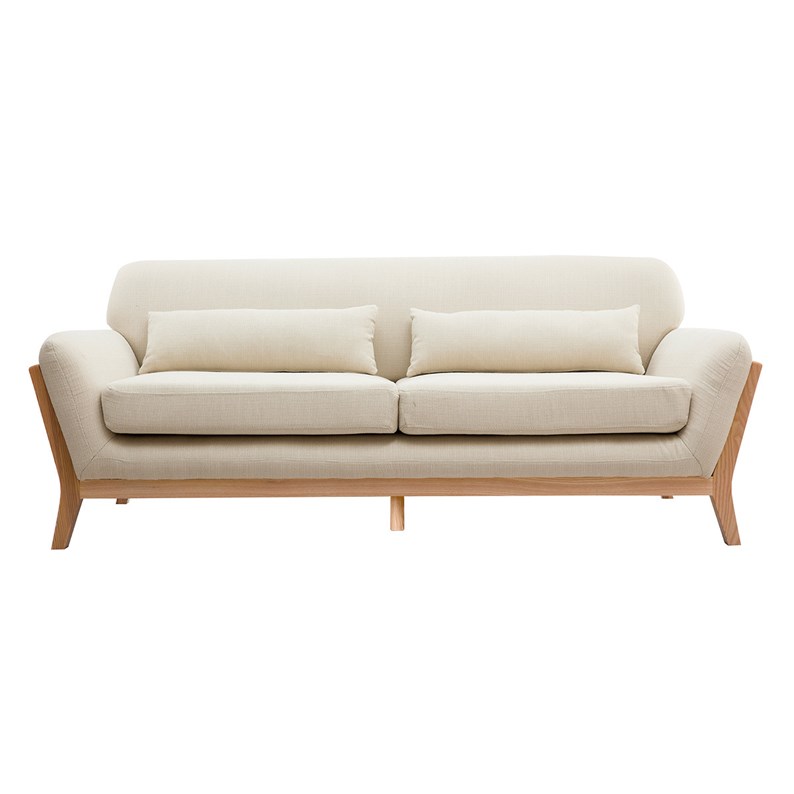 Confortable grâce à son haut dossier, sa large assise et ses deux coussins d'appoint cale-reins , ce canapé design en tissu beige et bois clair est définitivement aussi esthétique qu'accueillant.