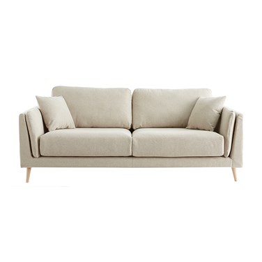 Esthétique, ce canapé en tissu beige et pieds bois est une assise 3 places des plus confortables ! Garnis d'une mousse haute résilience, dossier (densité 25 kg/m³) et assise (densité 30 kg/m³) s'accompagnent de deux petits coussins d'appoint pour garantir le confort d'un canapé ferme . Grâce à sa structure en pin et ses pieds en hêtre massif , ce modèle de canapé confortable est un allié solide pour aménager un salon déco et tout confort.