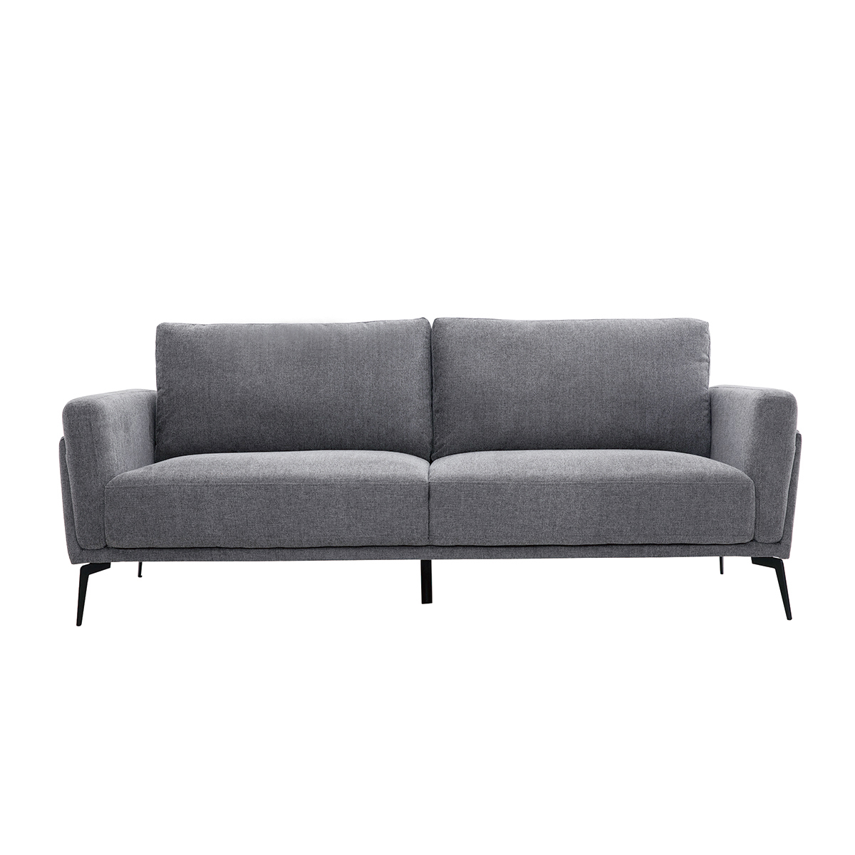 Le canapé MOSCO se pare d'un joli tissu effet velours texturé gris (100% polyester). Cette couleur sobre et intemporelle s'installe avec aisance dans tous les intérieurs. Ses quatre pieds hauts en métal noir (H17 cm) viennent ajouter à l'ensemble une touche moderne et chic.