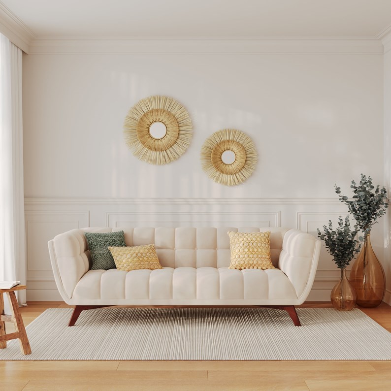 Le pied central du canapé Mona est volontairement légèrement plus court : il sert de renfort anti-affaissement, limite les bruits sur sols irréguliers et accompagne les mouvements naturels du bois dans le temps.Montage : Piètement à assemblerPoids produit : 43kgEntretien : Frotter avec un tissu sec et du savon liquide, puis nettoyer avec de l'eau et sécher rapidementInformation colis : Pour assurer la livraison en douceur de votre colis volumineux, nous vous recommandons vivement de vérifier les dimensions de vos portes et escaliers afin de garantir un transport sans encombre.220 x 90 x 57 cmRecyclabilité : Non recyclableLivraison offerte en bas de chez vous (rez-de-chaussée / portail d'entrée de l'immeuble ou de la maison). Bien vérifier le colis et le produit lors de la réception.