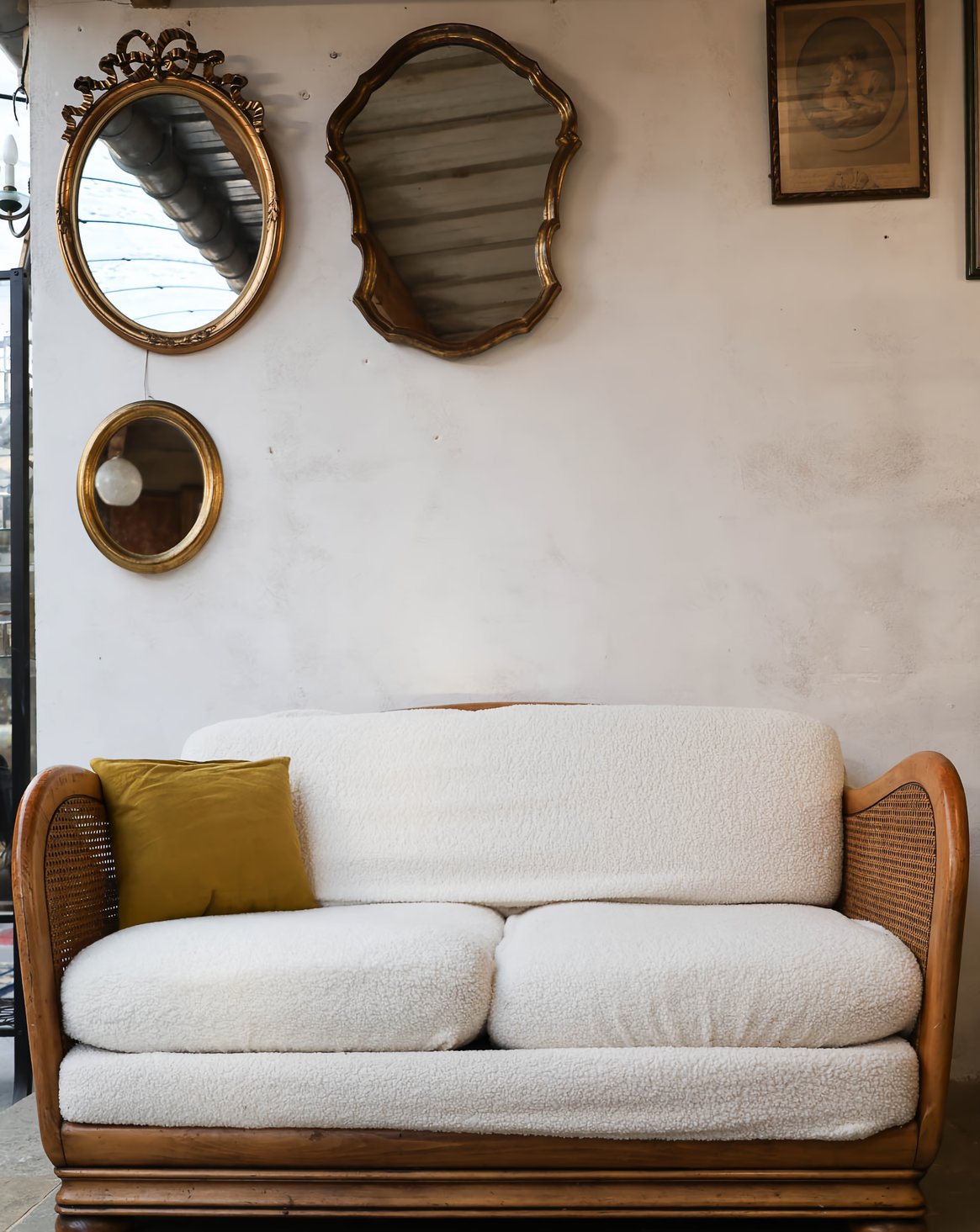 Adoptez ce canapé en bois au cannage délicat, habillé de coussins à housses déhoussables en Sherpa blanc qui invitent à la détente. Deux larges coussins d'assise et un grand coussin dossier offrent une assise profonde et généreuse, pensée pour partager un moment cosy ou lire au calme. Ses proportions et son bois chaleureux s'intègrent facilement dans un salon contemporain ou un coin intimiste, apportant une élégance naturelle et une ambiance confortable.