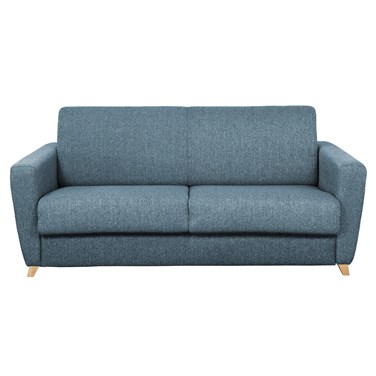 Canapé convertible 3 places en tissu bleu et bois clair avec matelas graham