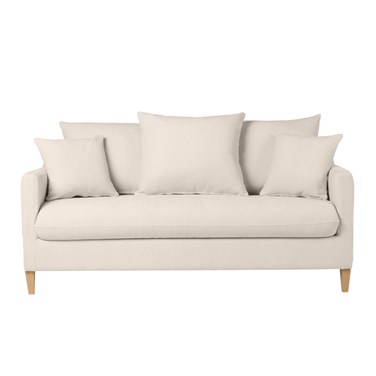 Canapé beige et bois clair livré prêt à monter. Montage simple, seuls les pieds sont à fixer. Le colis étant volumineux, nous vous conseillons de vérifier que portes et escaliers permettent son passage.