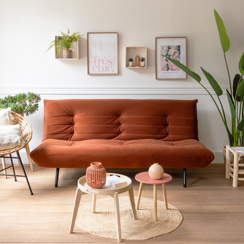 Le velours terracotta apporte de la chaleur dans la pièce. Sa texture douce donne envie de s'y installer. La structure en bois de pin soutient une assise généreuse, pensée pour le quotidien. En un geste, le canapé se transforme en couchage d'appoint. Pratique pour recevoir sans sacrifier l'esthétique. Les pieds en fer noir contrastent avec le tissu. Ce canapé trouve sa place dans un salon où l'on cherche à allier praticité et style. Il offre une assise confortable le jour et un lit discret la nuit.