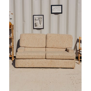 Adoptez ce canapé convertible en tissu bouclette beige, posé sur des pieds en bois, qui apporte une note douce et contemporaine à votre salon. Son assise se transforme facilement en lit double, offrant un couchage d'appoint confortable grâce à un matelas fin intégré, idéal pour recevoir sans empiéter sur l'espace. La texture bouclette et la chaleur du bois créent une ambiance chaleureuse et élégante. Quelques traces du temps présentes.