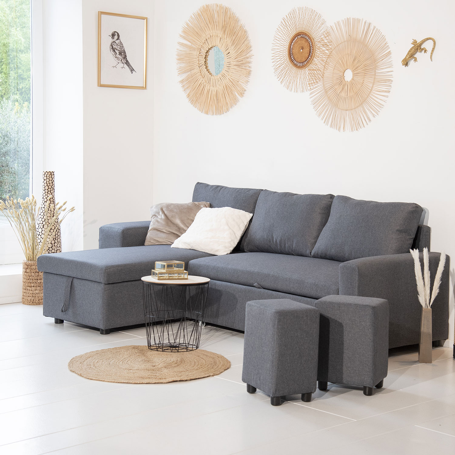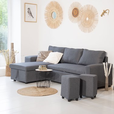 La méridienne est réversible et se place aussi bien à droite qu'à gauche selon vos besoins, option précieuse pour agencer votre pièce. Sous l'accoudoir de votre canapé vous trouverez deux poufs supplémentaires, pratique pour recevoir des invités de dernière minute.