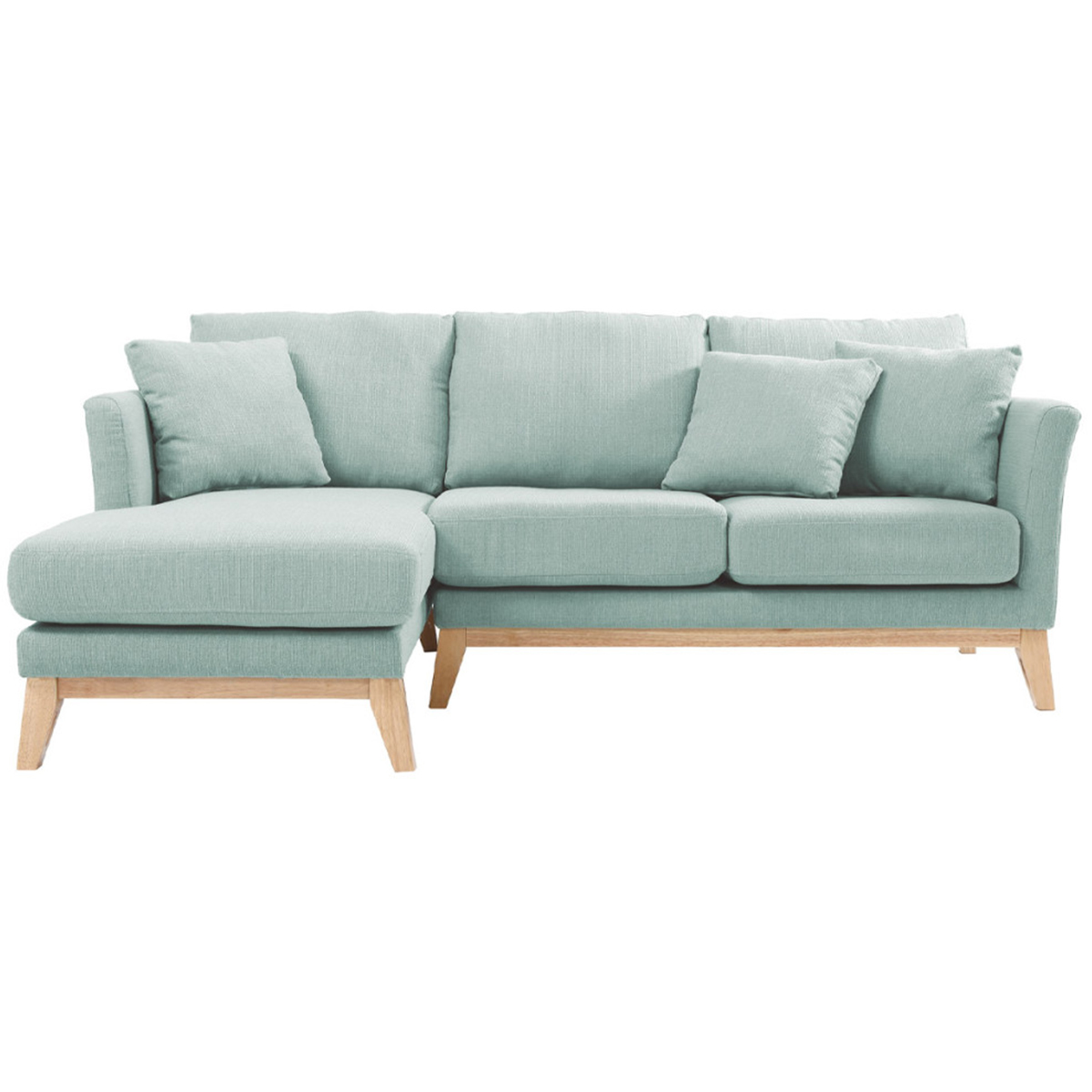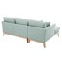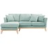 Ce canapé d'angle en tissu vert lagon est un concentré de tendance : un piètement en bois clair (chêne massif) légèrement évasé, une forme simple et épurée typique du design nordique , une couleur douce et lumineuse !