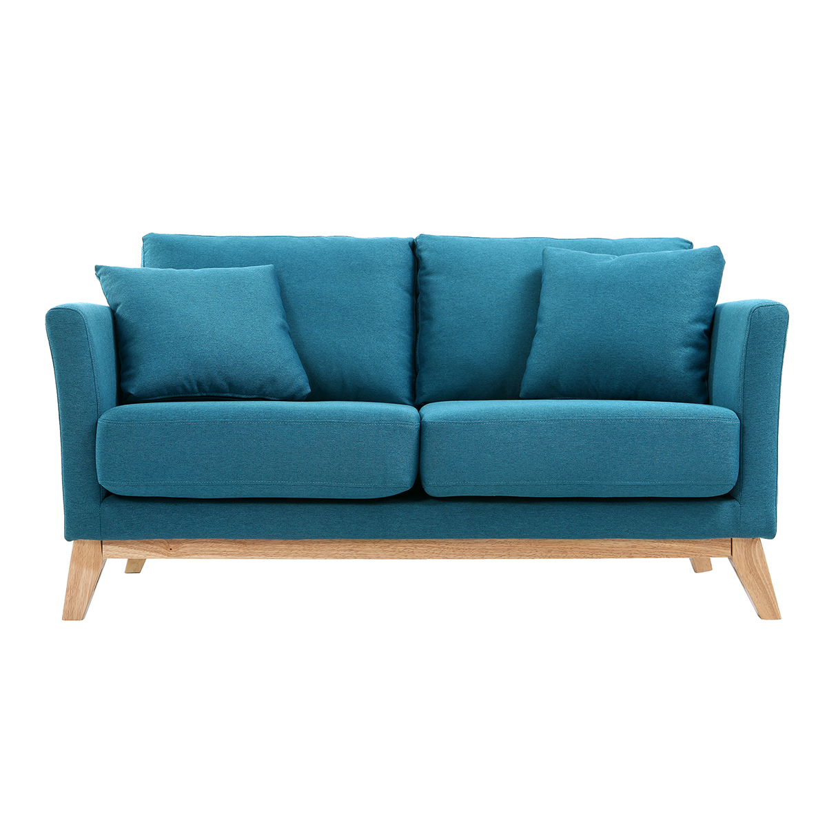 Canapé déhoussable 2 places en tissu bleu canard et bois clair oslo