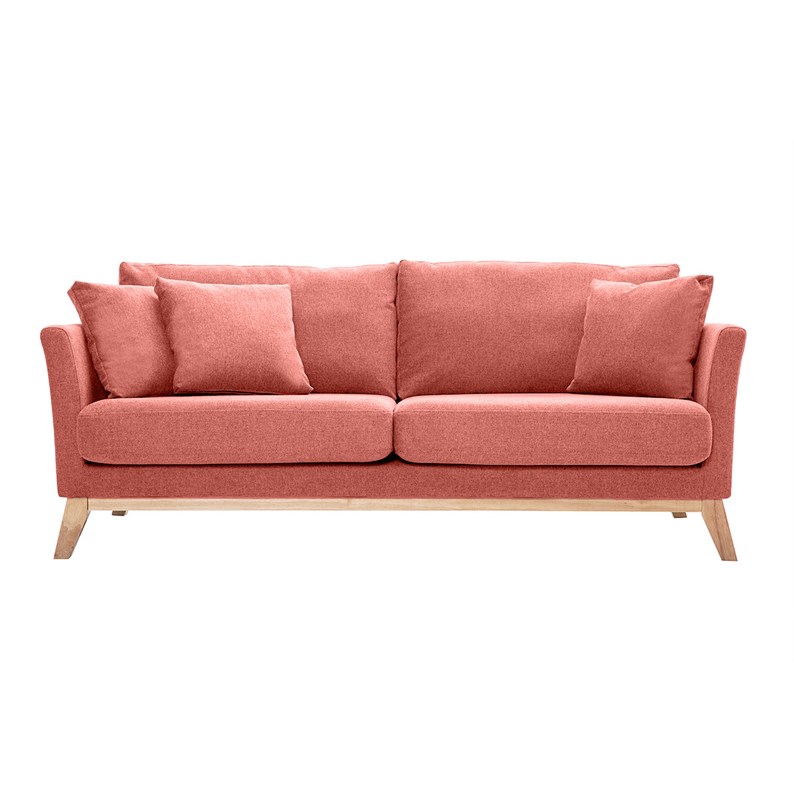 Pieds inclinés en bois clair, revêtement aussi doux au toucher qu'agréable au regard, formes fonctionnelles : ce canapé scandinave en tissu terracotta séduit par son caractère chaleureux.