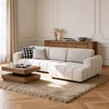 Canapé d'angle droit en tissu beige, doté d'une assise matelassée et de volumes généreux pour un confort optimal. Idéal pour structurer un salon élégant et convivial.