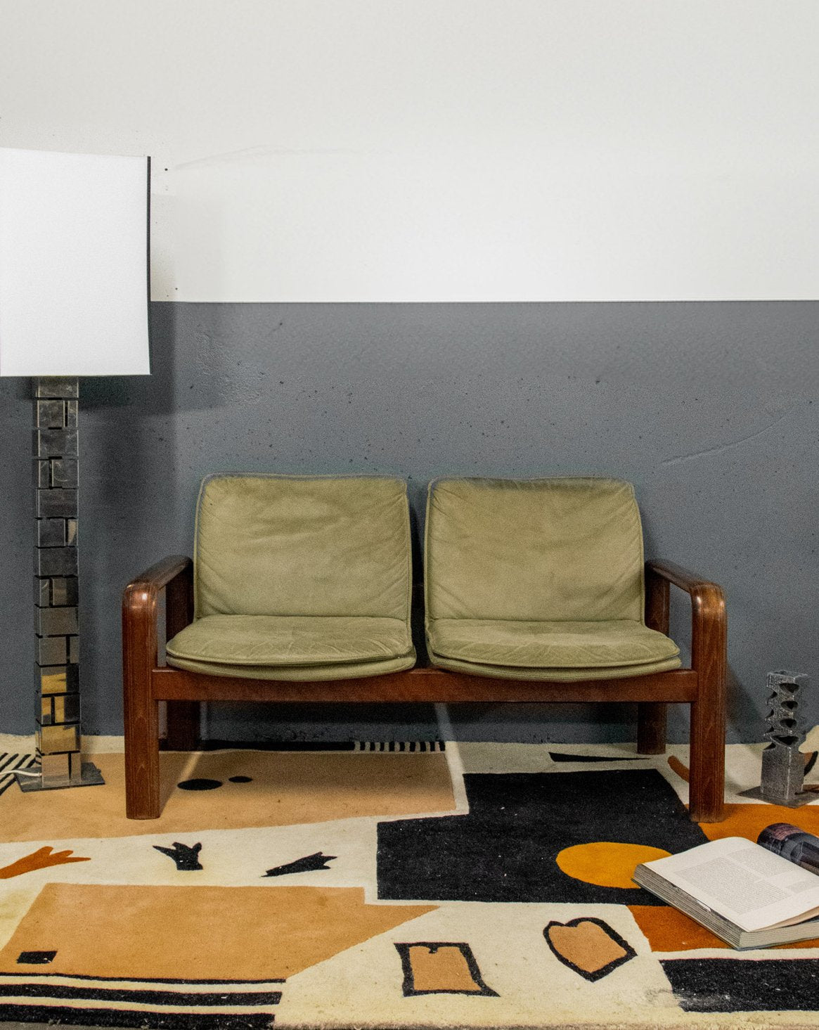 Adoptez ce canapé deux places en palissandre et cuir de buffle, de fabrication allemande des années 1970. Le cuir vert amande, délicatement patiné par le temps, apporte une douceur chromatique tandis que la structure en palissandre souligne des lignes nettes et une présence raffinée. Pensé pour un salon compact ou un coin lecture, il offre une assise intime et accueillante, idéale pour des instants de détente ou de conversation. Quelques marques d'usage qui font son authenticité.