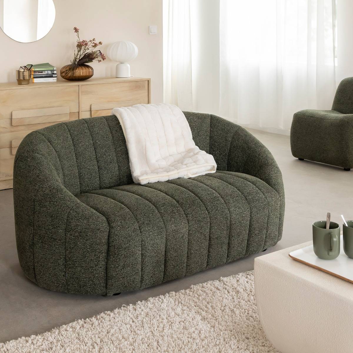 Canapé en tissu au design arrondi et capitonné. Confortable et élégant, parfait pour un salon moderne et convivial.