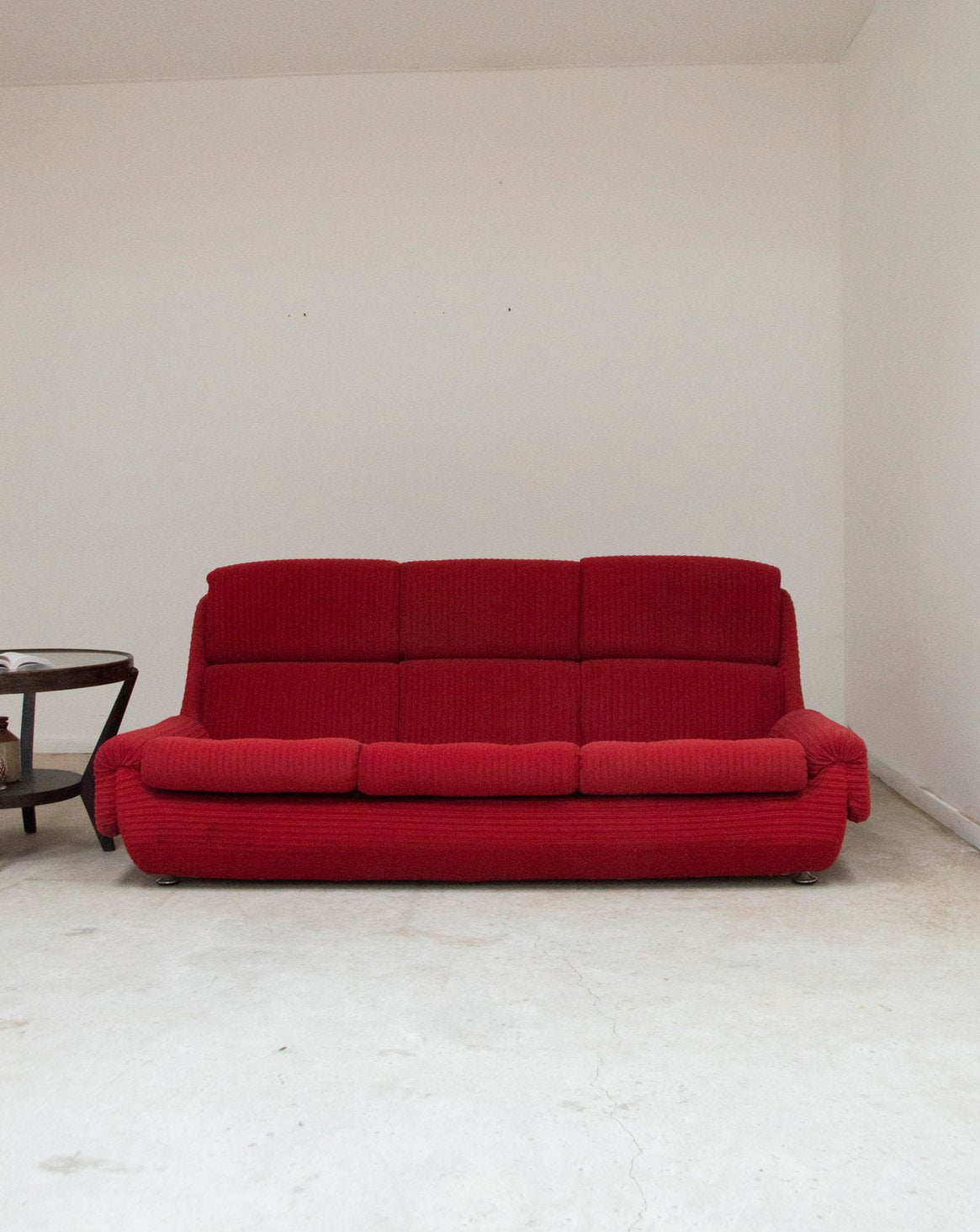 Adoptez ce canapé molletonné rouge, au velouté du tissu et aux lignes accueillantes qui invitent à la détente. Ses trois coussins d'assise et son garnissage généreux offrent une assise ample, idéale pour des soirées lecture ou des moments conviviaux entre amis, tandis que les petits pieds en métal apportent une touche contemporaine et fine. Sa silhouette affirme un style chaleureux et élégant qui réchauffe le salon. Légères traces du temps présentes.