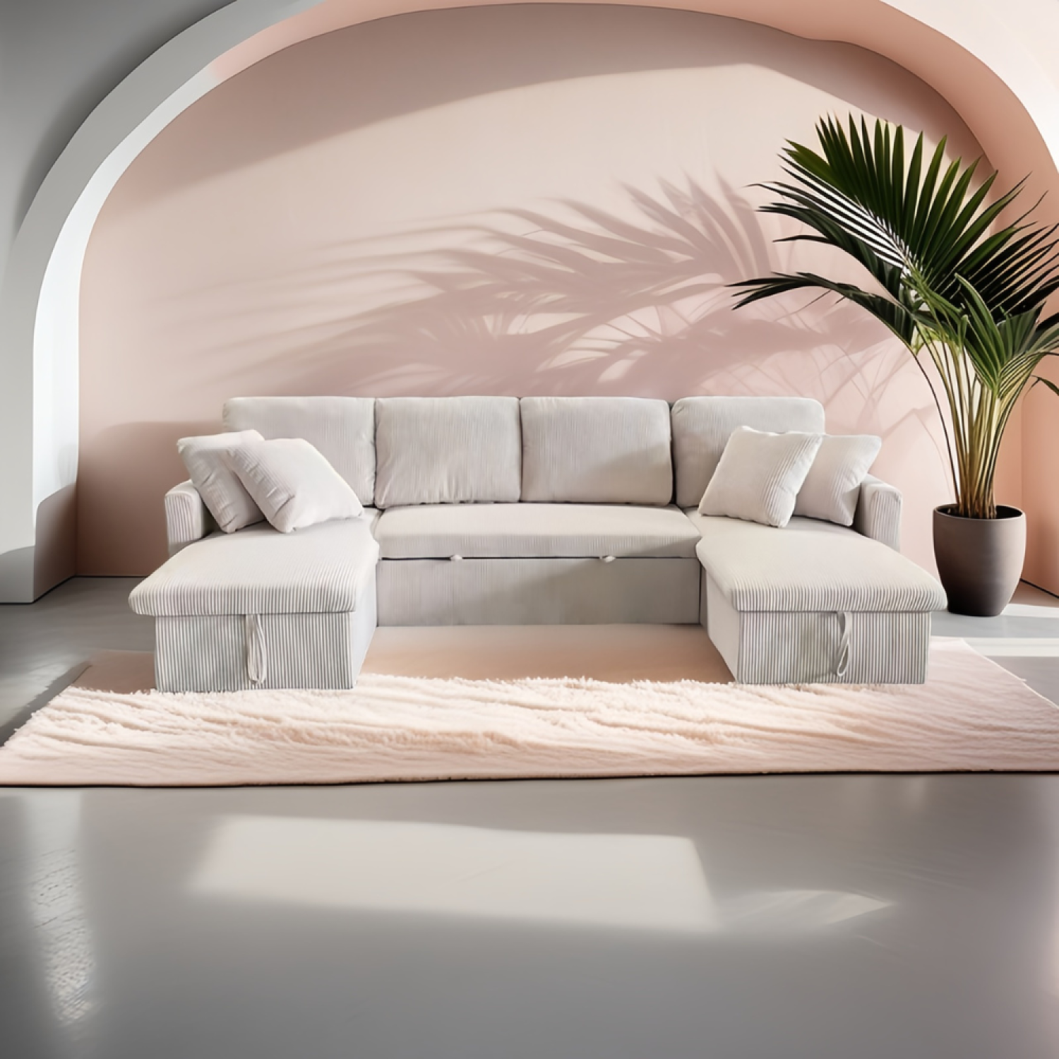Mahé canapé panoramique convertible 4 places en velours côtelé avec coffre - bei