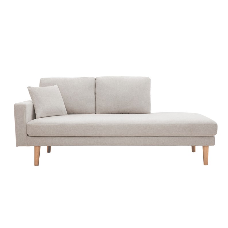 Méridienne scandinave en tissu effet velours texturé beige et bois clair massif L190 cm livrée prête à monter. Montage simple seul le piètement est à fixer. Le colis étant volumineux, nous vous conseillons de vérifier que portes et escaliers permettent son passage.