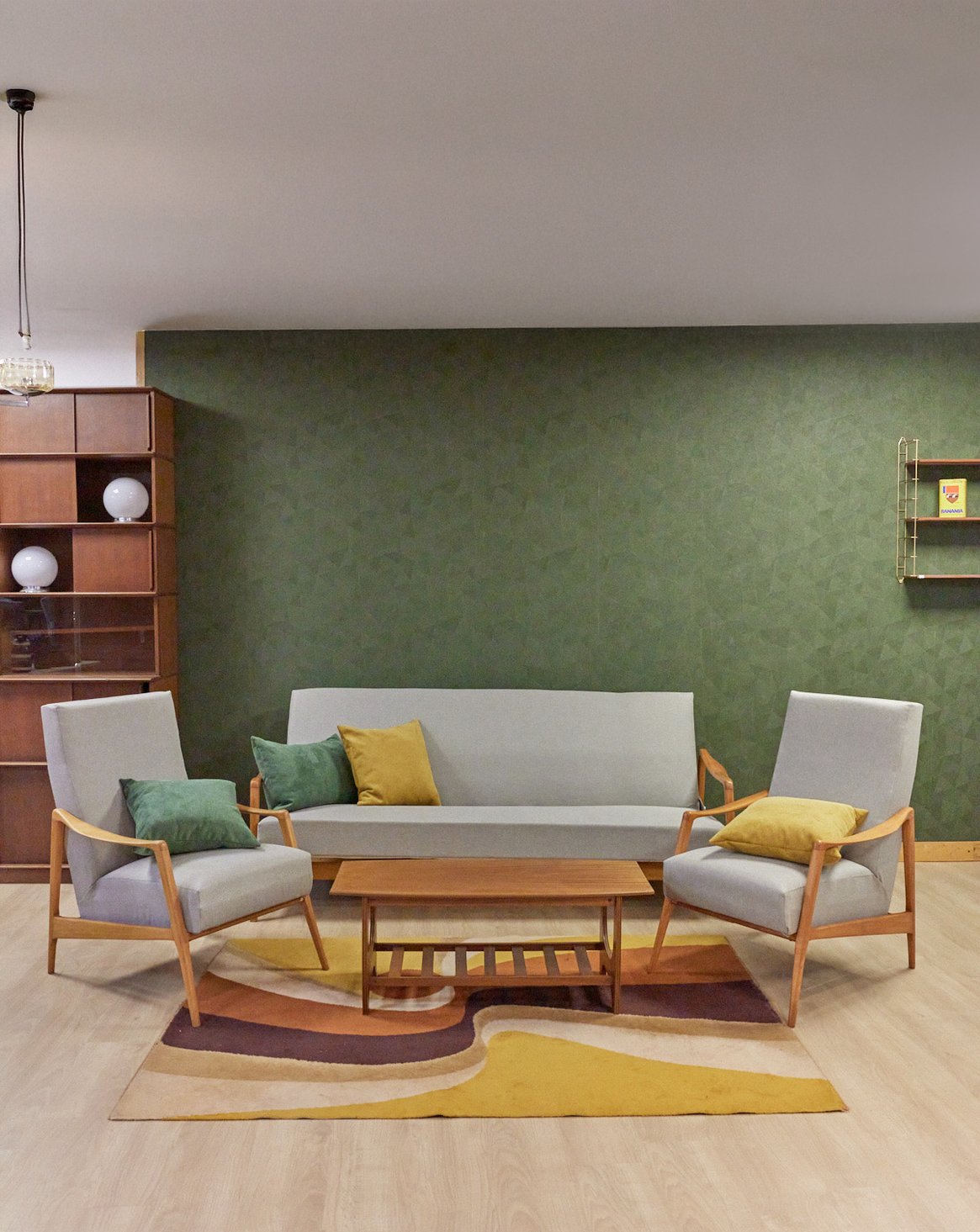 Adoptez cet ensemble de salon scandinave en bois et tissu refait à neuf, composé d'un canapé convertible et de deux fauteuils au design épuré et élégant. Les assises très confortables invitent à la détente quotidienne et le canapé convertible multiplie les usages. La structure en bois révèle des proportions équilibrées et une esthétique nordique intemporelle, idéale comme pièce centrale pour une atmosphère lumineuse et chaleureuse.