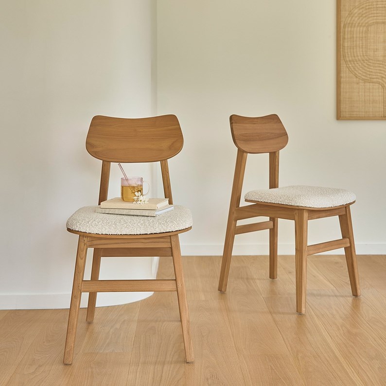 Ajoutez une touche d'élégance et de convivialité à votre espace de vie avec la chaise SERENE. Son design contemporain, la teinte naturelle du bois de teck et son assise en tissu bouclette en font un élément indispensable pour créer une atmosphère chaleureuse et accueillante chez vous. Caractéristiques : Matière : Teck - Couleur : Naturel - Hauteur : 85 cm - Profondeur assise : 40 cm - Largeur assise : 45 cm - Poids : 7 kg - Garantie : 5 ans - Montage : Livrée montée. Les + : Tissu bouclette - Confort - Teck massif