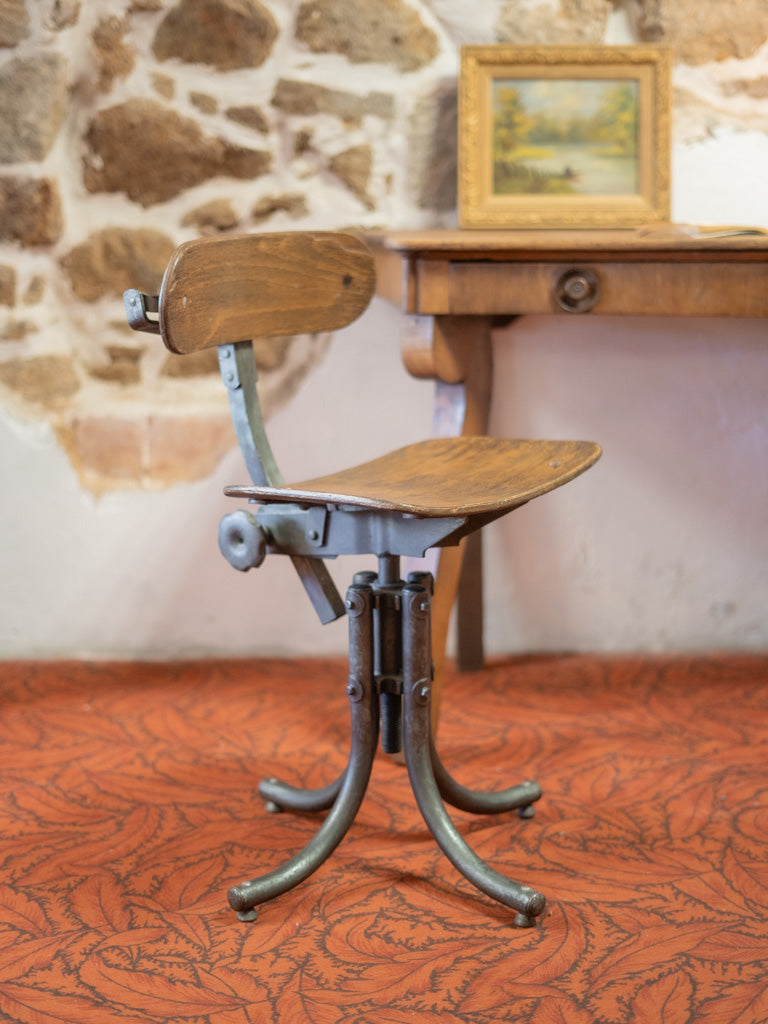 Découvrez cette ancienne chaise d'atelier de la marque Bienaise, datant de 1948. Fabriquée en bois et métal, elle allie charme vintage et fonctionnalité. Son mécanisme de montée et descente, ainsi que ses réglages en hauteur et en inclinaison, en font une pièce à la fois confortable et adaptable. Les traces du temps racontent son histoire et ajoutent du caractère à votre espace. Un incontournable pour allier style rétro et praticité dans votre intérieur.
